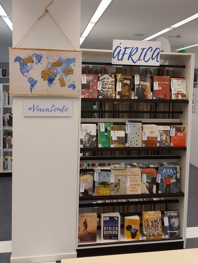 Seguimos tirando do fío e chegamos ao noso recuncho de #Viaxalendo, un pequeno espazo que reservamos na sala de adultos dedicada á literatura dun país, polas nosas estanterías xa viaxamos a Xapón, Irlanda, India ou Portugal. Desta volta no podiamos deixar de dar voz a unha literatura tan rica pero tan descoñecida como a do continente africano. Desde o norte ao sur. Alí poderedes encontrar obras de J.M. Coetzee (Sudáfrica), Jose Eduardo Agualusa (Ángola), Yasmina Kadra (Alxer), Leila Slimani (Marrocos) e tantos outrxs.