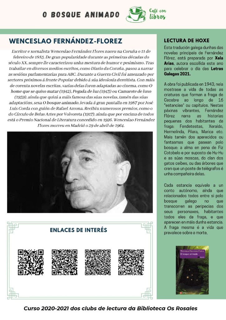Este ano a homenaxeada polas Letras Galegas 2021 foi a autora Xela Arias, poeta, tradutora, editora e profesora, quixemos aproveitar a efeméride para achegarnos a súa faceta como tradutora da man da obra O bosque animado do autor coruñés Wenceslao Fernández Florez . Esta lectura deunos a oportunidade de aproximarnos a estas dúas grandes figuras e poñer en valor a importancia dunha boa tradución. A lectura trouxo consigo novamente unha mostra bibliográfica, centrámola na tradución ao galego, resaltando o traballo editorial en Galicia na actualidade: Rinoceronte, Hugin e Munin, Irmás Cartoné, Catro Ventos, Kalandraka, etc.