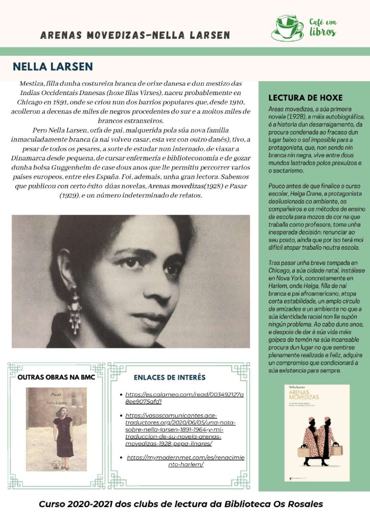 Pechamos o círculo literario deste primeiro trimestre con Arenas movedizas de Nella Larsen. A evocadora primeira novela desta autora (1928), a máis autobiográfica, é a historia dunha muller que vive entre dous mundos lastrado polos prexuízos e o sectarismo. Autora esquecida e reinvindicada por algunhas figuras actuais como Alice Walker, Toni Morrison e Maya Angelou que veñen de rescatar do esquecemento aos artistas do chamado Renacemento de Harlem e, entre eles, á nosa autora, para introducila non xa no canon das escritoras afroamericanas, senón no das autoras estadounidenses de calquera cor.