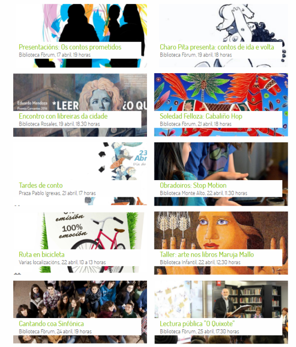 Un ano máis as Bibliotecas Municipais da Coruña non podemos deixar que pase o 23 de Abril sen honrar como se merece ó libro e a lectura. Este ano, ademáis de adicar un especial á literatura en galega, onde recomendamos libros e autores contemporáneos que podedes atopar nas nosas bibliotecas, imos volver demostralo coas seguintes actividades que se desenvolverán nas nosas bibliotecas.