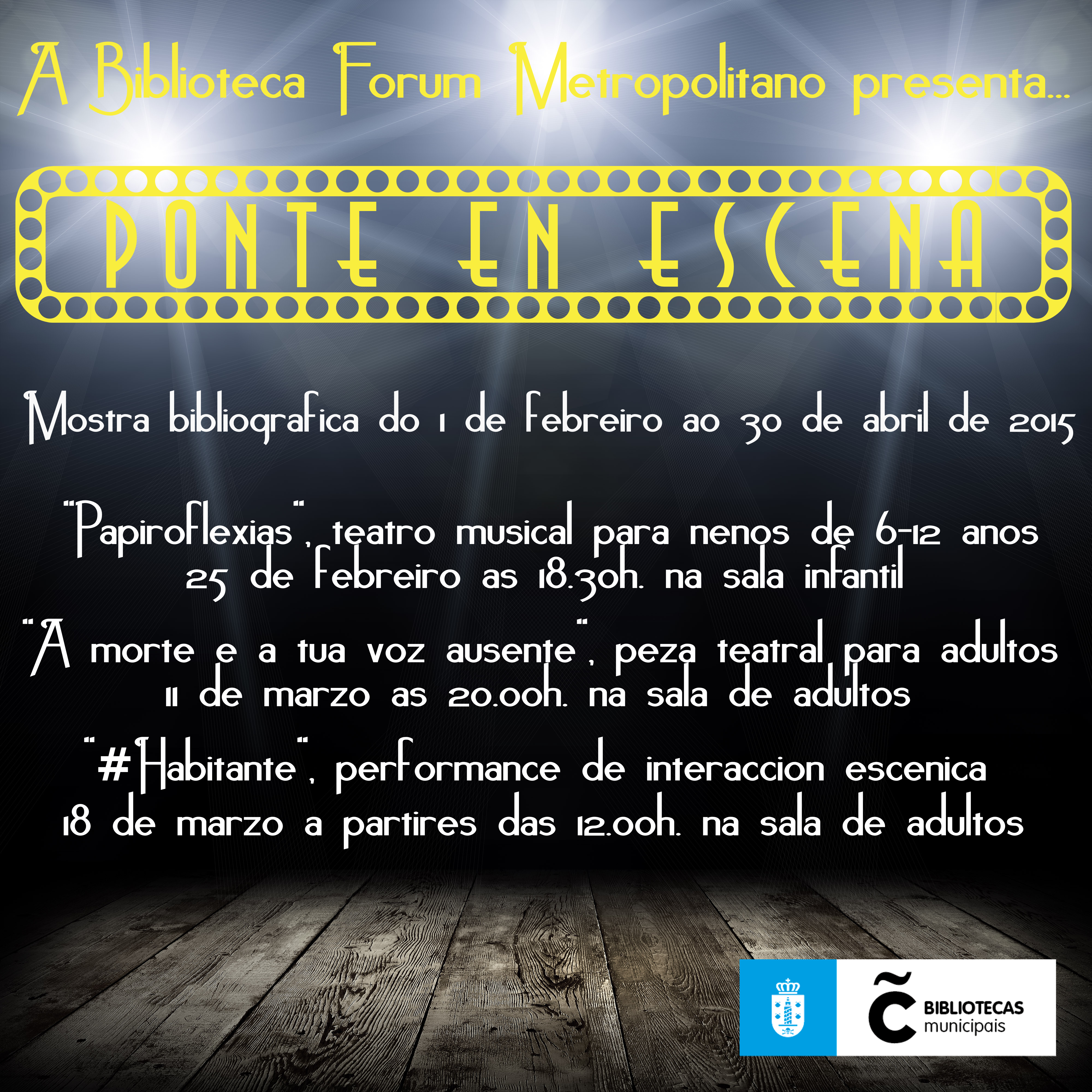 Dende as Bibliotecas Municipais da Coruña propoñémosvos así achegarvos ao xénero do teatro e da escena. Podedes coñecer os fondos que integran a mostra no seguinte wiki “Ponte en escena”,  na Guía de lectura da mostra. E acceder á galería fotográfica do flickr.
